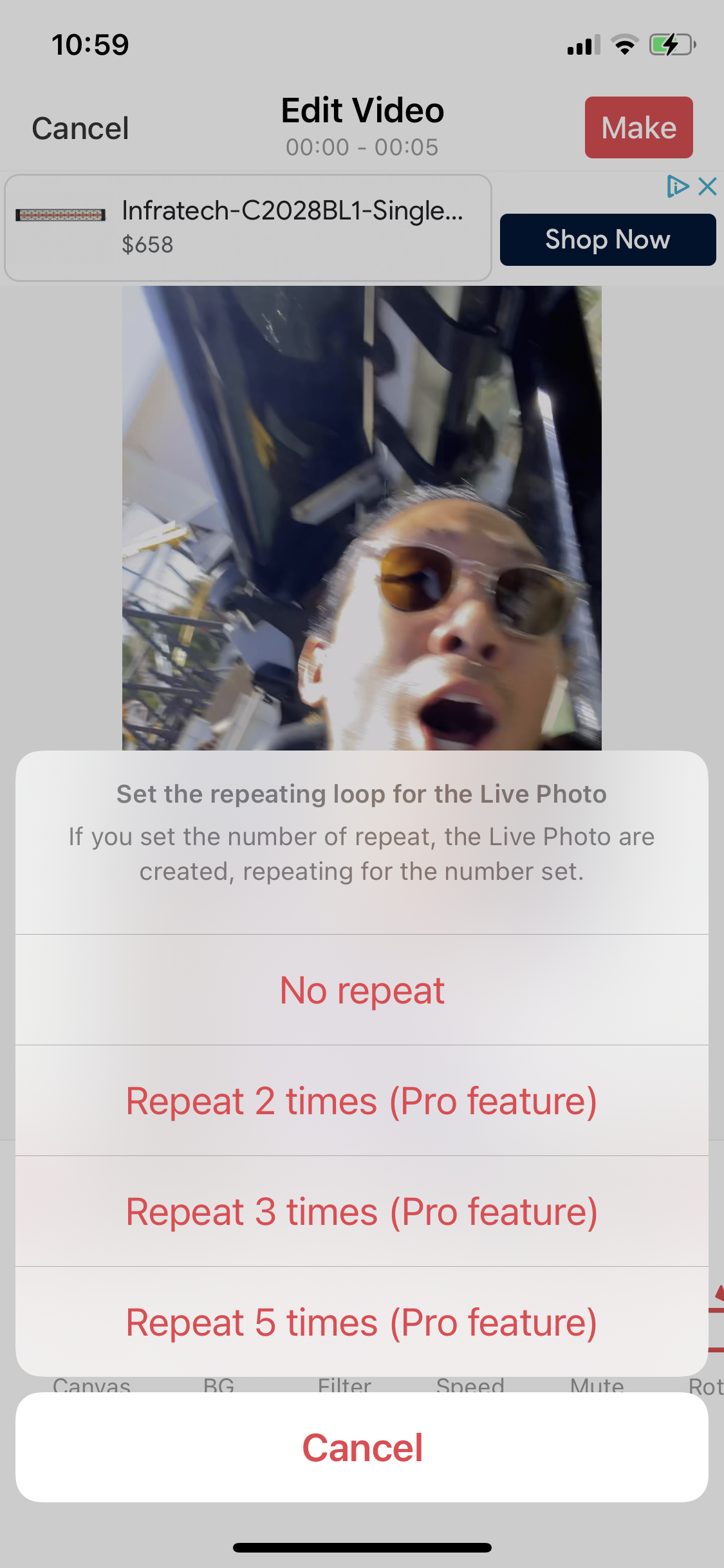 a. Click on the “No repeat” option to skip looping your video. Any other option requires you to purchase the Pro version of the app. This is not necessary unless you really want it.
